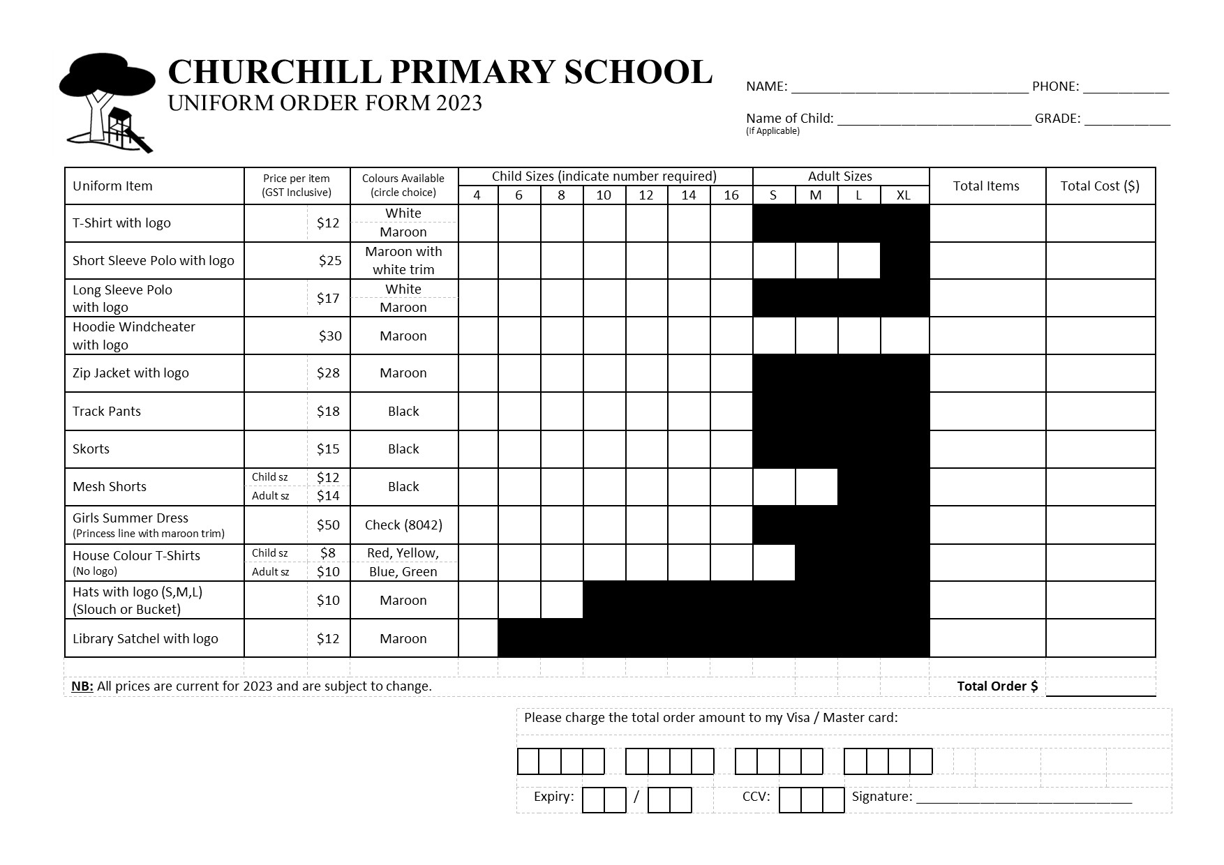 School uniform at Churchill Primary School is compulsory. The main school colours are burgundy, white and black. The uniform can be purchased through the Uniform Shop or local retail outlets. Please note that school hats are compulsory in Terms 1 & 4.